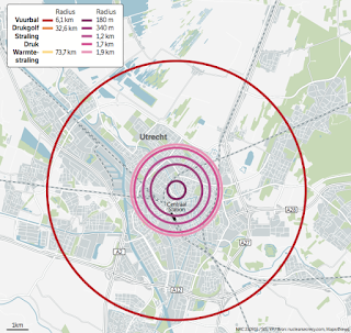 NRC Handelsblad twee kaarten. De eerste laat zien welk deel van Nederland in dat geval geraakt zou worden, met Utrecht als kern (de rode, oranje en gele lijnen). De tweede kaart is ter vergelijking: deze toont welk deel van Utrecht geraakt zou worden door een atoombom als die op Hiroshima (de roze en paarse lijnen).
